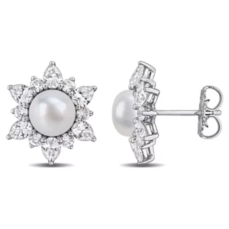 Lab Created 7-7.5mm Freshwater Cultured Pearl & Created White Sapphire Floral Earrings in Sterling Silver in Franklin, TN