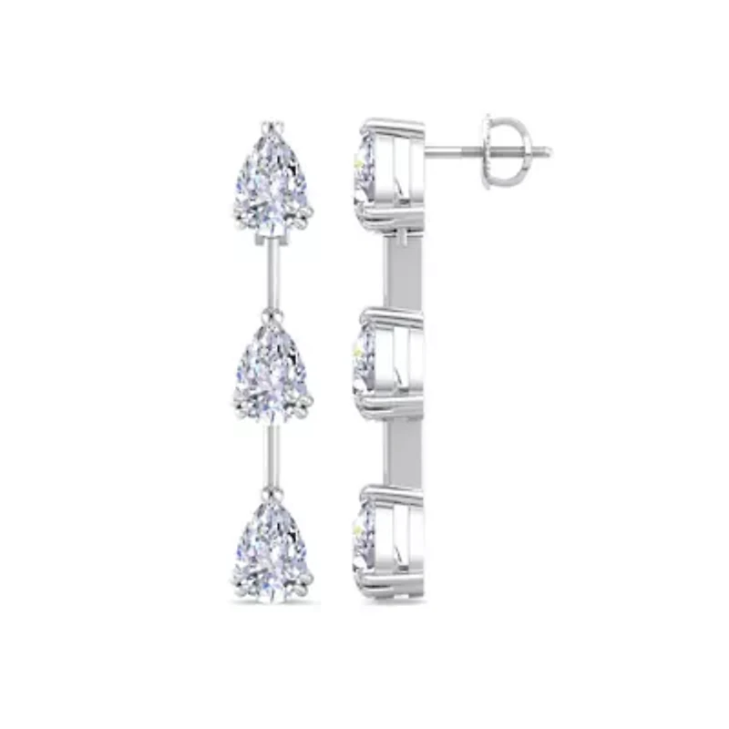 Showcasing class, style and timeless sophistication, the Martha Stewart fine jewelry collection is here to be celebrated. These Martha Stewart lab grown diamond earrings feature six pear shape lab grown diamonds in G-H color, VS clarity. Total carat weight is 5 carats. These earrings are in Sterling Silver and have post with friction backs. These earrings are set in the signature Martha Stewart double-prong setting and dangle down over 1 1/2 inches! Whether worn for a special event or to enhance everyday elegance, these earrings are sure to become cherished heirlooms. Martha Stewart’s attention to detail and dedication to quality shine through in every piece, making this collection a celebration of refined craftsmanship and timeless beauty. 2 6 Clarity rating: VS Polished finish Prong setting Choking hazard Warranty available, Limited liability warranty, 60 days USA Imported Product Specifications 37mm More than 2 ct. t.w. Material & Care Butterfly clasp Metal, Sterling silver Clean with a soft bristle brush or cloth and warm soapy water.