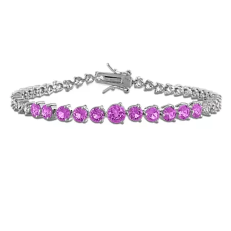 Elegant and sparkling, this sterling silver bracelet features 8.39 CT of created pink and white sapphires. The box clasp ensures a secure fit, while the refined design adds a touch of sophistication and charm. Perfect for elevating any outfit with a subtle yet luxurious sparkle. Box clasp, 11 created pink sapphire, 32 created white sapphire Polished finish Prong setting Warranty available, 60 days Thailand Imported Product Specifications 7.25" 8.39ct. t.g.w. created pink sapphire, created white sapphire Material & Care Sterling Silver Metal, Sterling silver Clean with a soft cloth.