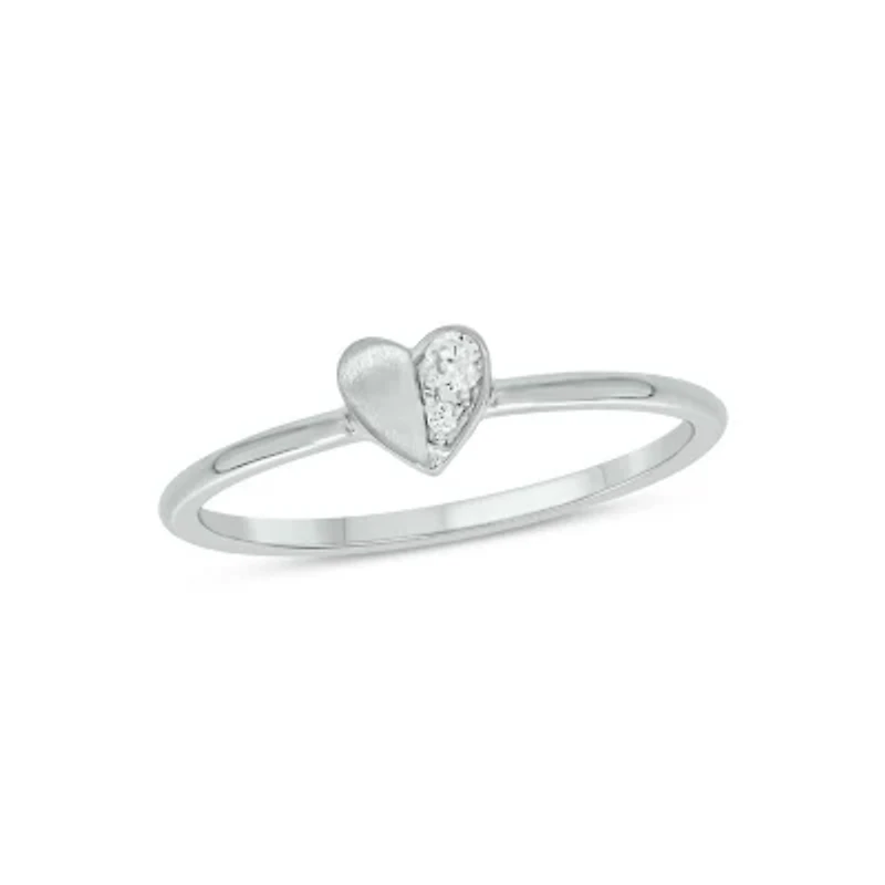 Add sweet sparkle to your style with this chic fashion ring in sterling silver with a white finish. Featuring a polished open heart accented with a shimmering SI1 clarity diamond, this minimalist piece is full of charm. Light, modern, and perfect for stacking or solo wear, it brings a flirty and feminine touch to any everyday look 2 Color rating: F Clarity rating: SI1 Polished finish Pave setting India Imported Belk Exclusive Product Specifications 5.22X5.22X1.93 0.042 Material & Care Metal, Sterling silver Clean with a soft cloth.
