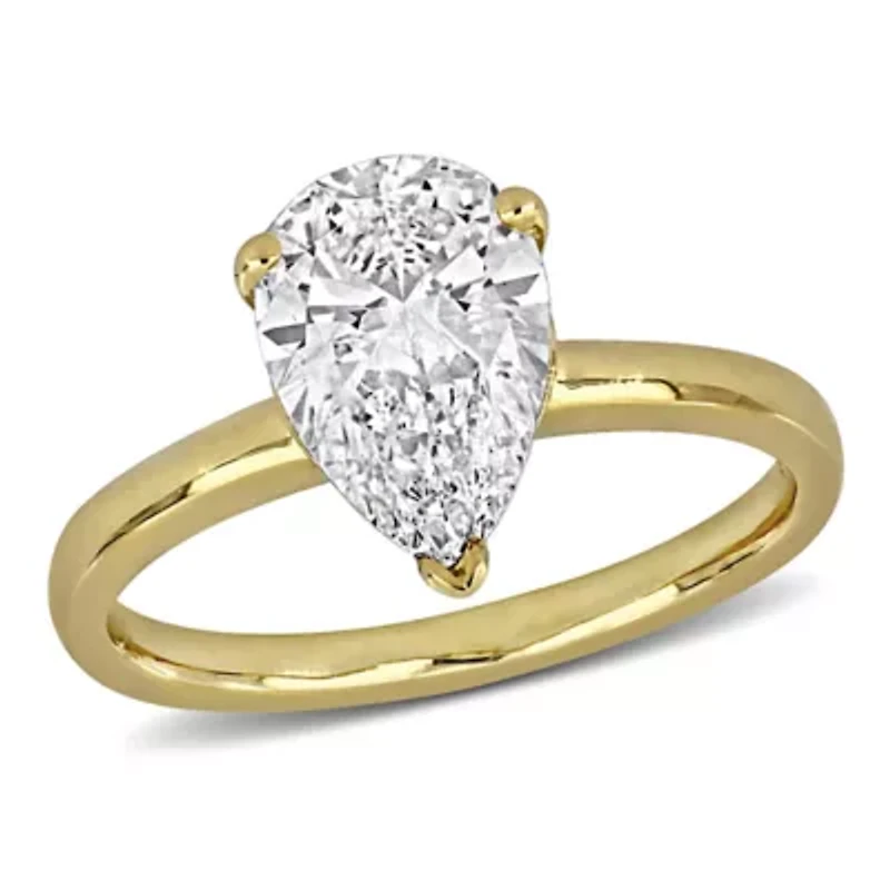 This pear-shaped solitaire engagement ring is crafted in 14k gold with a choice of white or yellow tones. The lab-grown diamond at the center radiates brilliance and captures light from every angle, drawing the eye to its elegant shape. The polished gold setting enhances the diamond’s natural sparkle while keeping a refined and timeless design. With careful attention to detail this ring embodies sophistication and serves as a meaningful symbol of love and commitment. Its classic design ensures it will be treasured for both everyday wear and special occasions. 1 lab grown diamond Color rating: G, H Clarity rating: VS1-VS2 Polished finish Prong setting Warranty available, 60 days Canada Imported Belk Exclusive Product Specifications 12-mm width x 8-mm height 2 ct. t.w. lab grown diamond Material & Care 14K Yellow Gold Metal, Yellow Gold Clean with a soft cloth.