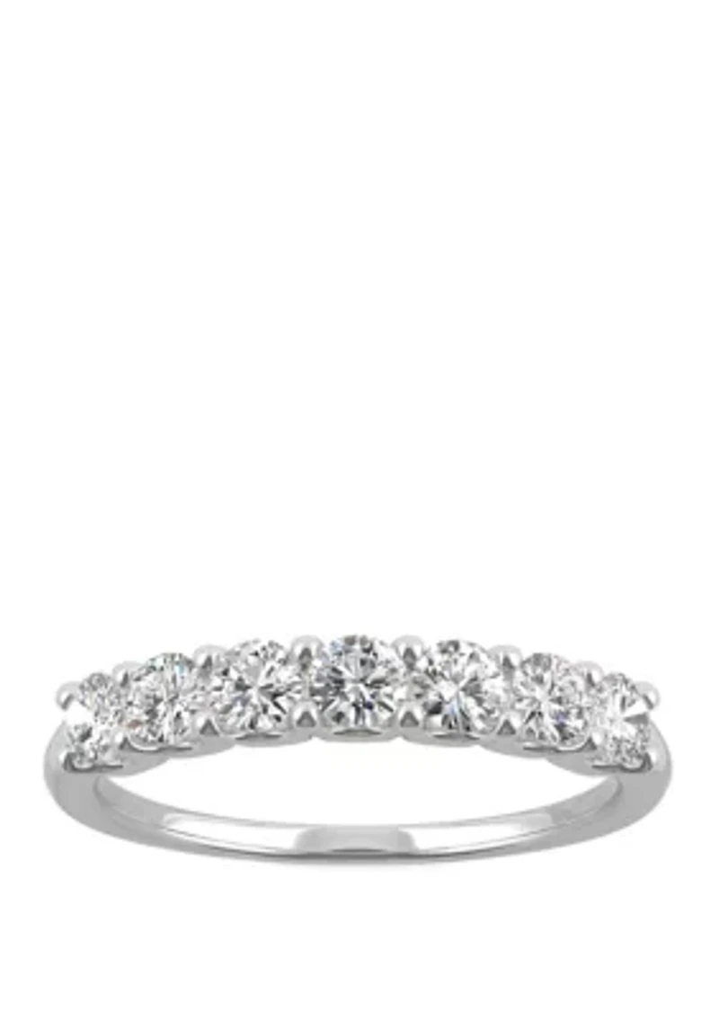 Chic simplicity at its finest. This 14k white gold anniversary band holds a row of sparkling moissanite accent stones in a shared prong setting, with a total diamond equivalent weight of 0.7 ct. t.w., perfect for stacking, or as a sweet solo statement. 7 Moissanite stones Color rating: G, H, I Clarity rating: SI-I2 Prong setting Polished finish Imported Product Specifications 3.13 mm L x 2.31 mm W x 3.4 mm H 3/4 ct. t.w. Diamond Equivalent Weight Material & Care 14K White Gold Clean with a soft cloth