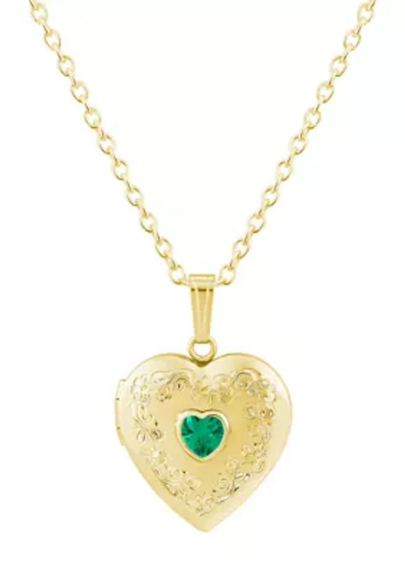This beautiful locket pendant necklace showcases a 5mm Heart Shape Created Emerald bezel set on the front with an internal slot to hold a cherished photo close to your heart. Crafted in Yellow Gold-Plated Sterling Silver. Lobster closure, 1 Polished finish Bezel setting United States Imported Belk Exclusive Product Specifications 18-20 Inches 0.45 Material & Care Metal, Gold plated Clean with a soft cloth.