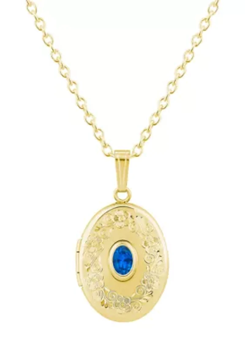 This beautiful locket pendant necklace showcases a 6x4mm Oval Created Sapphire bezel set on the front with an internal slot to hold a cherished photo close to your heart. Crafted in Yellow Gold-Plated Sterling Silver. Lobster closure, 1 Polished finish Bezel setting United States Imported Belk Exclusive Product Specifications 18-20 Inches 0.72 Material & Care Metal, Gold plated Clean with a soft cloth.