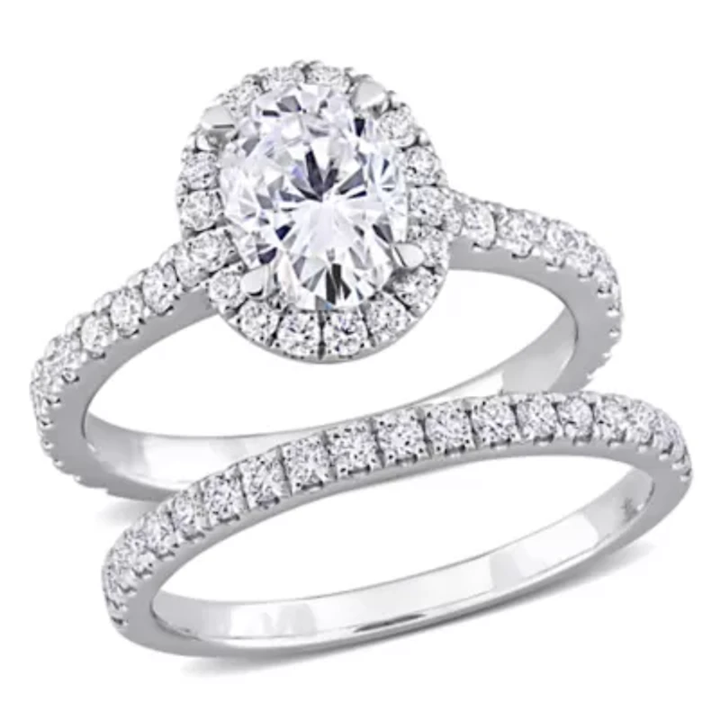 Celebrate your forever with this exquisite 14k white gold bridal ring set. Featuring a dazzling combination of oval and round-cut lab-grown diamonds in a halo design, it sparkles brilliantly from every angle. Its timeless elegance and romantic silhouette capture the essence of love and commitment, making it a perfect symbol of your special journey together. More than a ring set, it embodies devotion, sophistication, and enduring beauty that lasts a lifetime. 2 61 lab grown diamond Color rating: G, H Clarity rating: VS1-VS2 Polished finish Prong setting Warranty available, 60 days Canada Imported Belk Exclusive Product Specifications 16-mm width x 20.2-mm height 2.27 ct. t.w. lab grown diamond Material & Care 14K White Gold Metal, White gold Clean with a soft cloth.