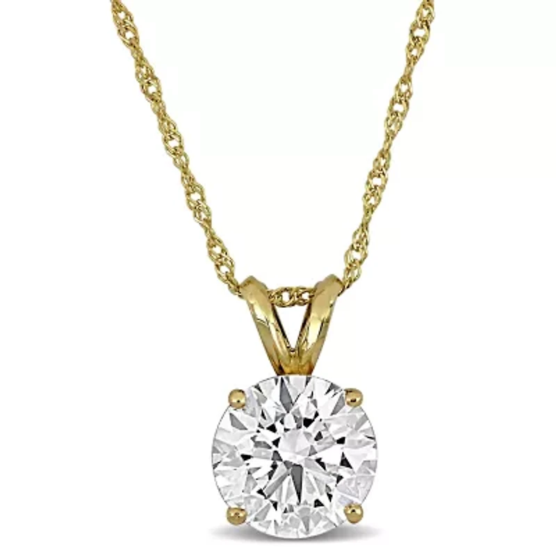 Elevate your everyday elegance with this 14k yellow gold solitaire pendant. A radiant lab-grown diamond rests at the center, suspended gracefully from a delicate chain for a look that is both timeless and refined. Its classic design allows the brilliance to take center stage, adding effortless sophistication to any outfit. More than a simple accent, it’s a symbol of confidence, beauty, and enduring style. Lobster closure, 1 lab grown diamond Color rating: G, H Clarity rating: VS1-VS2 Polished finish Prong setting Warranty available, 60 days Canada Imported Product Specifications 9.25-mm width x 15-mm height, 18" 3 ct. t.w. lab grown diamond Material & Care 14K Yellow Gold Metal, Yellow Gold Clean with a soft cloth.