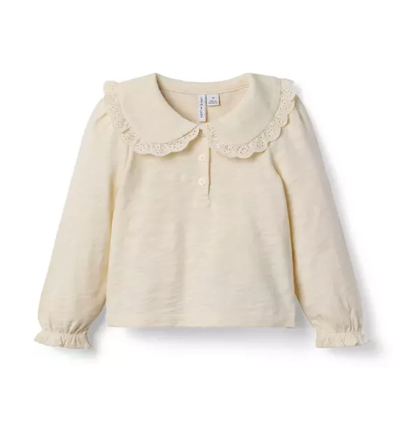 Style starts at the collar. Our soft cotton top features a lace-trimmed Peter Pan collar and ruffle cuffs too. 100% Cotton Slub Long Sleeve Half Button Placket Now Including Tween Sizes Up To 16 Online Exclusive Machine Washable; Imported