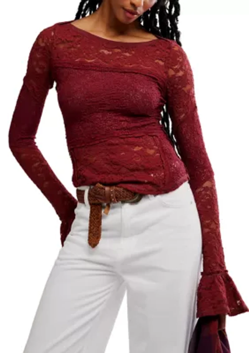 Romantic and sheer, this lace long-sleeve is the perfect layering piece for any occasion. Fit: Slim-fitting silhouette Features: Soft stretch lace, boat neckline, flared cuffs, scalloped hem detail, sheer design Why We ❤ It: A delicate essential that pairs effortlessly under slip dresses or styled solo with your favorite jeans for an effortlessly chic vibe. Unlined Imported Product Specifications 21.75" L Material & Care Cotton Machine washable