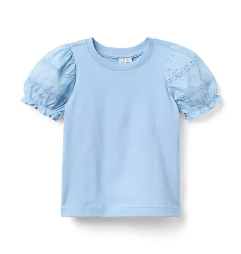 Wear your style on your sleeve. Our soft jersey top features puff sleeves with lace details and ruffle cuffs too. 100% Cotton Jersey; Sleeve: 100% Cotton Batiste Short Sleeve Online Exclusive Machine Washable; Imported