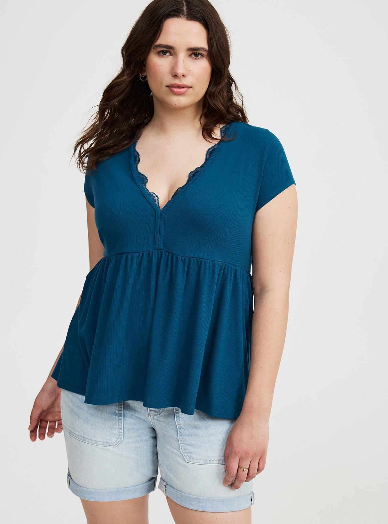FIT Measures 28'' from shoulder (size 2). MATERIALS + CARE Super Soft Rib knit fabric: Tucked in or not, this ultra-soft and stretchy textured knit is your perfect base layer. Stretch level: Maximum. 66% polyester, 34% rayon, 10% spandex. Machine wash cold. Line dry. Imported. DETAILS V-shaped neckline. Short sleeves. Lace trim. Babydoll silhouette.