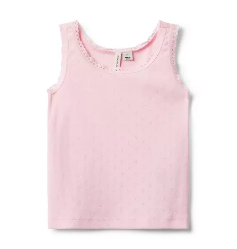 A wardrobe essential perfect for warm days or just because. Made in the softest cotton with details to love, like lace trim and allover pointelle. 100% Cotton Pointelle; Lace Trim: 83% Nylon/17% Spandex Sleeveless Machine Wash, Gentle Cycle; Imported