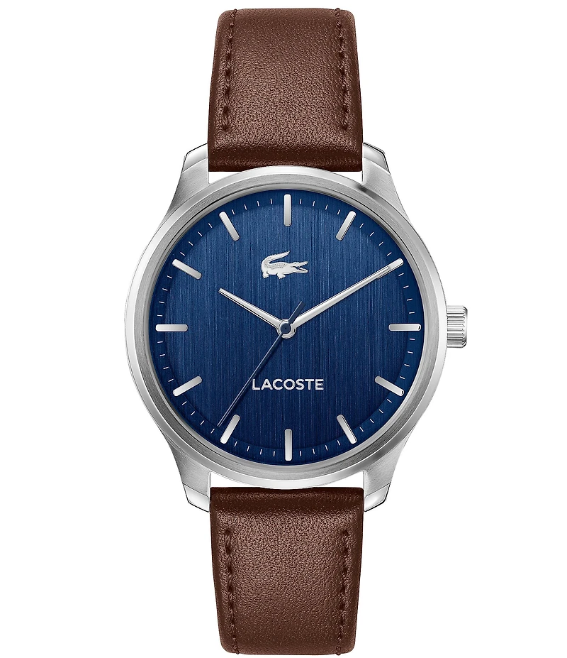 From Lacoste, this men's watch features: Leather strap Stainless steel case Brushed dial Buckle closure Three hand movement Case size approx. 42 mm Water Resistance: 5 ATM Imported.