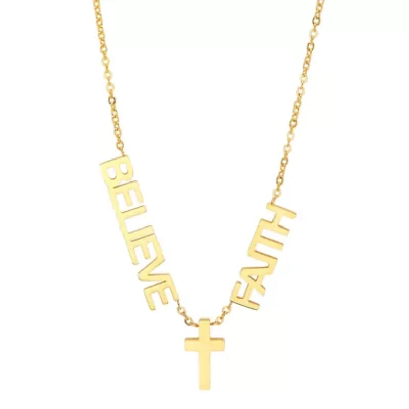 Ladies 18k gold plated stainless steel Faith, Believe, and cross necklace Lobster closure Imported Product Specifications 17" ext 1" x 0.1" W, believe: 0.2" L x .2" W, faith: 0.2" L x 1" W, cross: 0.6" L x 0.3" W Material & Care stainless steel Stainless steel Clean with a soft cloth.
