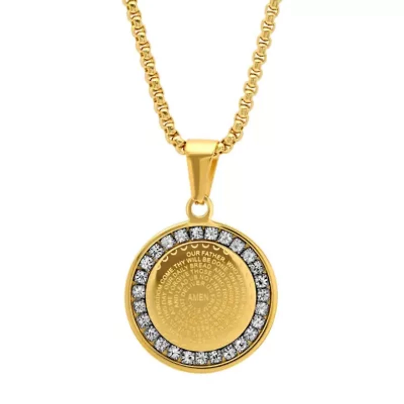 Ladies 18k gold plated stainless steel Our Father prayer round pendant with simulated diamonds Lobster closure Imported Product Specifications 18" chain, pendant: 25mm, 27 total stones, 0.81 cttw Material & Care stainless steel Stainless steel Clean with a soft cloth.
