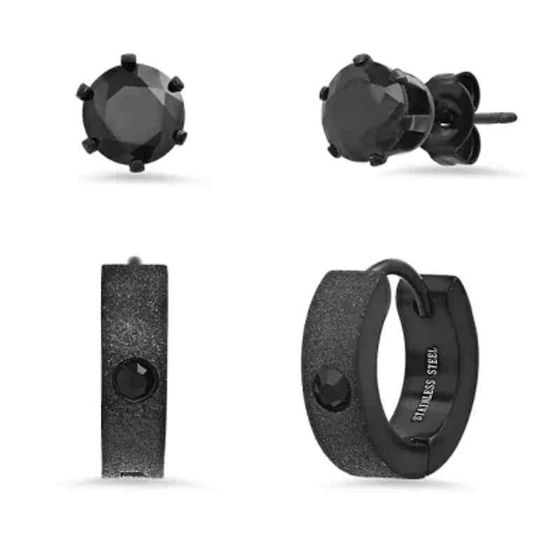 Ladies black ip stainless steel simulated black diamonds studs and sand dusted huggie 2pc earrings setLadies black ip stainless steel simulated black diamonds studs and sand dusted huggie 2pc earrings set