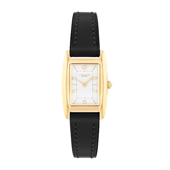 A classic design, the minimalist reese watch is an elevated choice for everyday wear. Silver-white dial with numeral and stick indexes; mineral crystal 20. 0 x 30. 0mm gold-tone ion-plated stainless steel case quartz analog movement black leather strap; buckle clasp water-resistant to 30 meters we are an authorized coach dealer