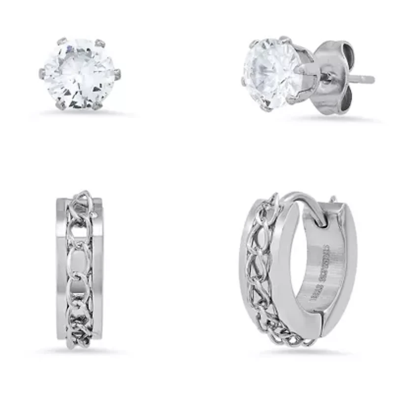 Ladies stainless steel and simulated diamonds studs/huggie earrings set with cuban chain accents 2 Hinge post earring, Pinch Imported Product Specifications huggies: 14mm, studs: 6mm=0.84ctw Material & Care stainless steel Stainless steel Clean with a soft cloth.