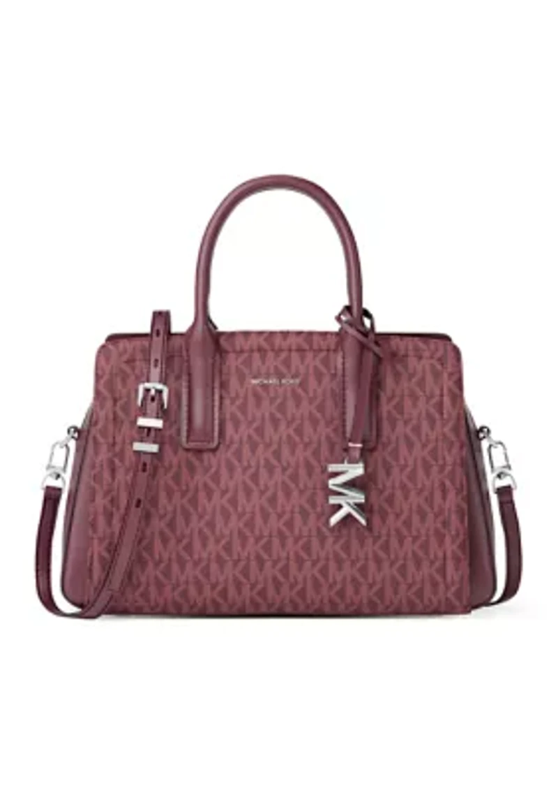 MICHAEL Michael Kors' satchel is a must-have for the modern woman. Crafted from durable PVC material, it's designed to withstand daily wear and tear. The spacious interior and multiple compartments keep your essentials organized, while the adjustable strap provides comfortable carrying options. Its compact size makes it perfect for everyday use, whether you're running errands or meeting friends for lunch. Zip closure Removable strap, double top handles with 3.5" drop Imported Product Specifications 10" W x 7.25" H x 4.75" D Material & Care PVC Wipe clean