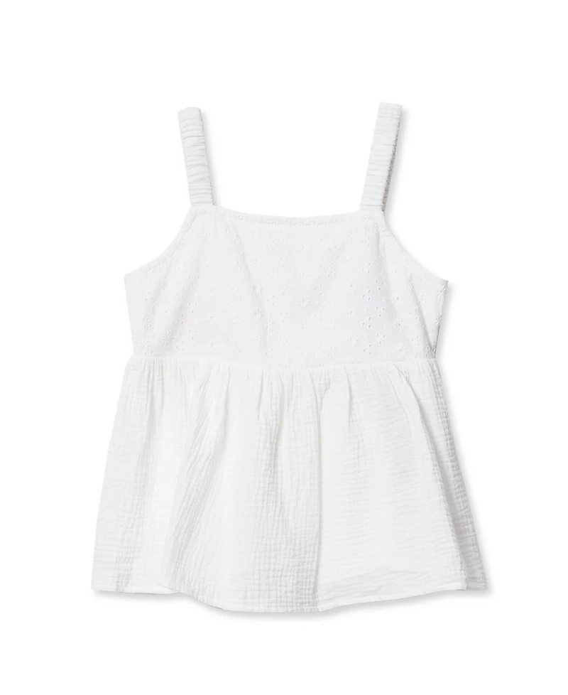 Woven comfort with cutout details. Our Girls Woven Tank Top offers breezy comfort with its cotton-viscose blend and full cotton lining. The elastic-enhanced straps and back provide a perfect fit, while the sweet back cutout adds personality. Perfect for summer in its versatile waist-length design..