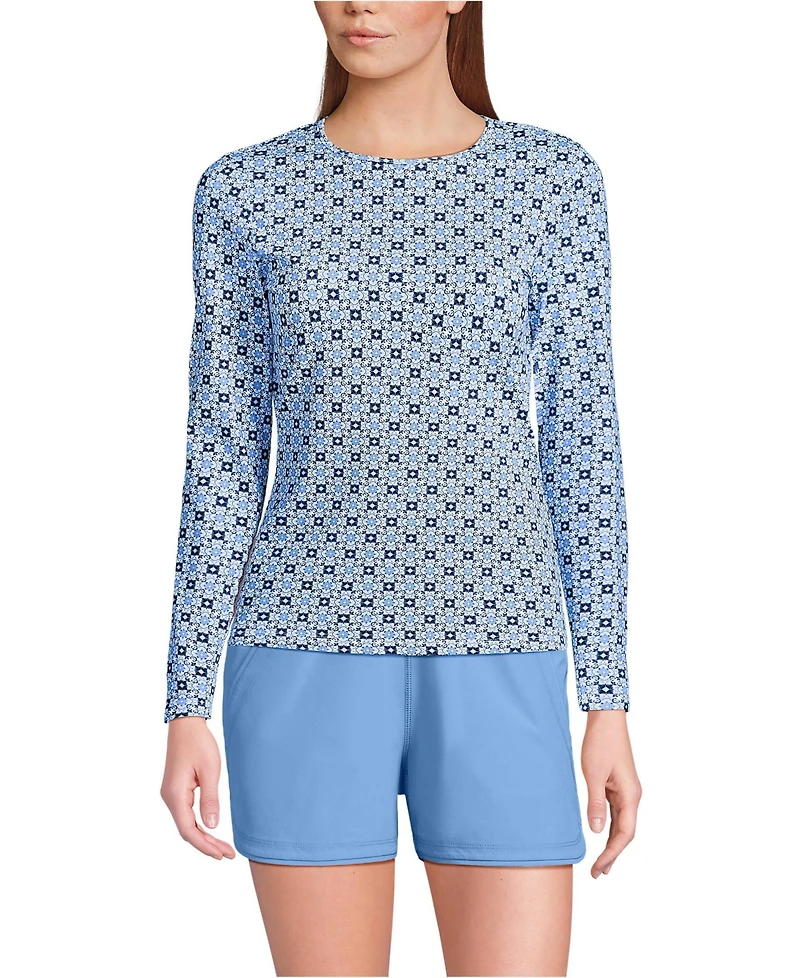 At Lands End we believe every body is a swimsuit body and everybody should feel confident in their swimwear. Our Women Crew Neck Long Sleeve Rash Guard Modest Swim Tee is no exception. Lightweight and soft this tee is made with Lycra Xtra Life spandex. It is specially designed to keep its shape in and out of the water and hold up all summer long. It offers Upf sun protection wherever it has you covered. We promise you re going to love this fun and flattering crewneck long sleeve modest swim tee..