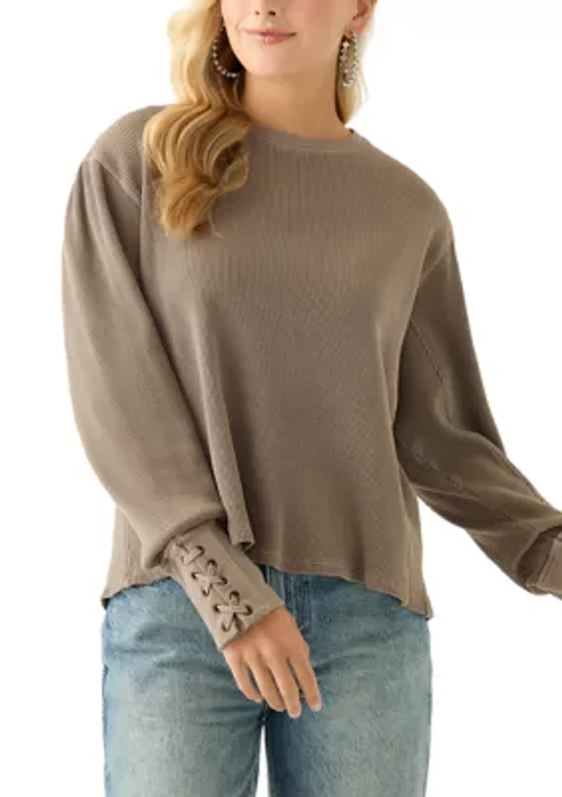 Lace-up details adorn the cuffs of this laidback long sleeve from Free People, We The Free. Featured in a classic thermal fabrication with voluminous sleeves for added dimension. Pullover Round neck Long drop shoulder sleeves Unlined Relaxed, oversized fit Imported Product Specifications 23" L Material & Care 100% cotton, waffle Machine washable