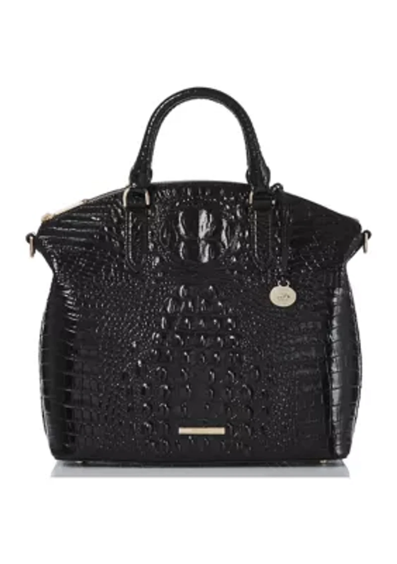 The Large Duxbury Satchel is a great everyday bag with a convertible shoulder strap and plenty of interior space. Carry your iPad along with your favorite essentials. Large zip top dome satchel Double handles Removable adjustable crossbody strap Back slide in pocket Footed bottom Dust bag included 4" handle drop 13" strap drop Imported Product Specifications 14.2'' W x 12.0'' H x 5.00'' D Material & Care Leather Clean with a soft cloth