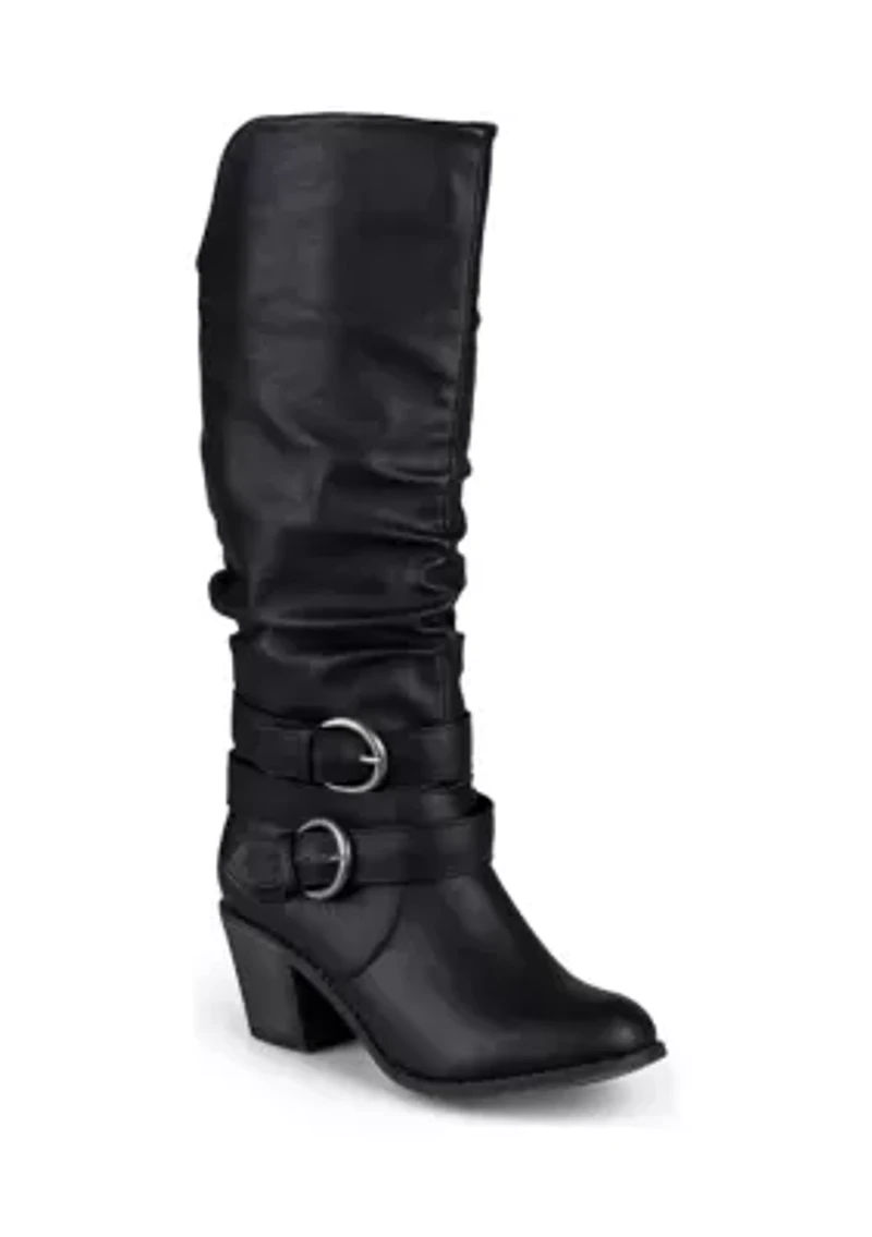Step into trend-setting style with these buckle boots by Journee Collection. These fashionable wide-calf boots feature premium faux leather uppers that rise mid-calf with slightly raised angular vamps in the front. Slip-on Round toe Padded insole Imported Product Specifications 0.5 in platform, 2.25 in heel Medium width Material Heel: polyurethane; Lining: fabric; Midsole and outsole: man-made Faux leather