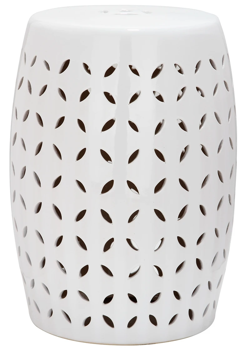 Embellished with a lattice pattern of stylized flower petal cut-outs, this sophisticated garden stool is crafted of ceramic and finished with a robin's egg blue glaze. Use as extra seating, as a handy side table or place several in a cluster for drama indoors or out.
