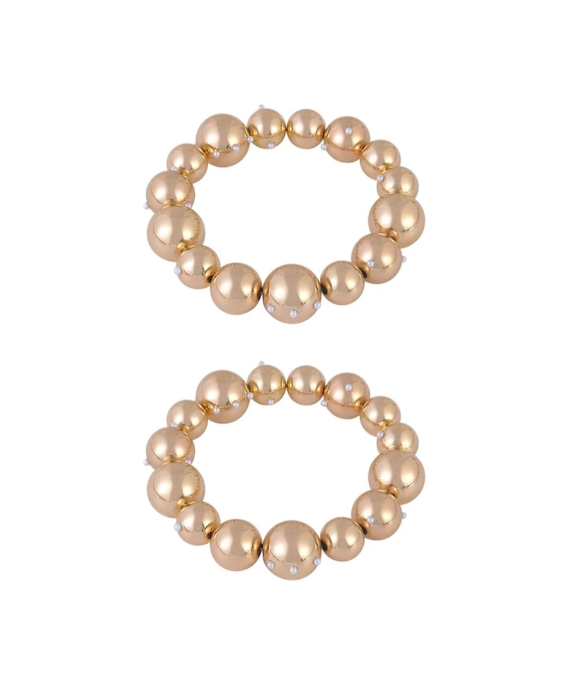 Elevate your wrist game with this chic 2-pack of gold-tone beaded stretch bracelets from Laundry by Shelli Segal. Featuring 14mm and 16mm beaded balls and delicate 2mm glass pearl bead accents, these bracelets add subtle shimmer and timeless elegance to any outfit. Stretch design ensures a comfortable fit, making them perfect for layering or wearing solo.