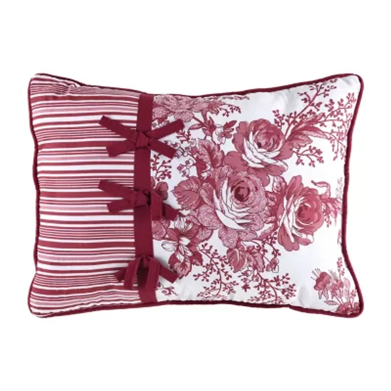 This beautiful decorative pillow coordinates with the Toile Garden bedding collection and adds an extra layer of texture and detail to your bed. Quilted oblong pillow features pieced center diamond and striped corners with tie details reverses to floral toile measures 16x12" Cotton with polyester fill. Spot clean. Imported.
