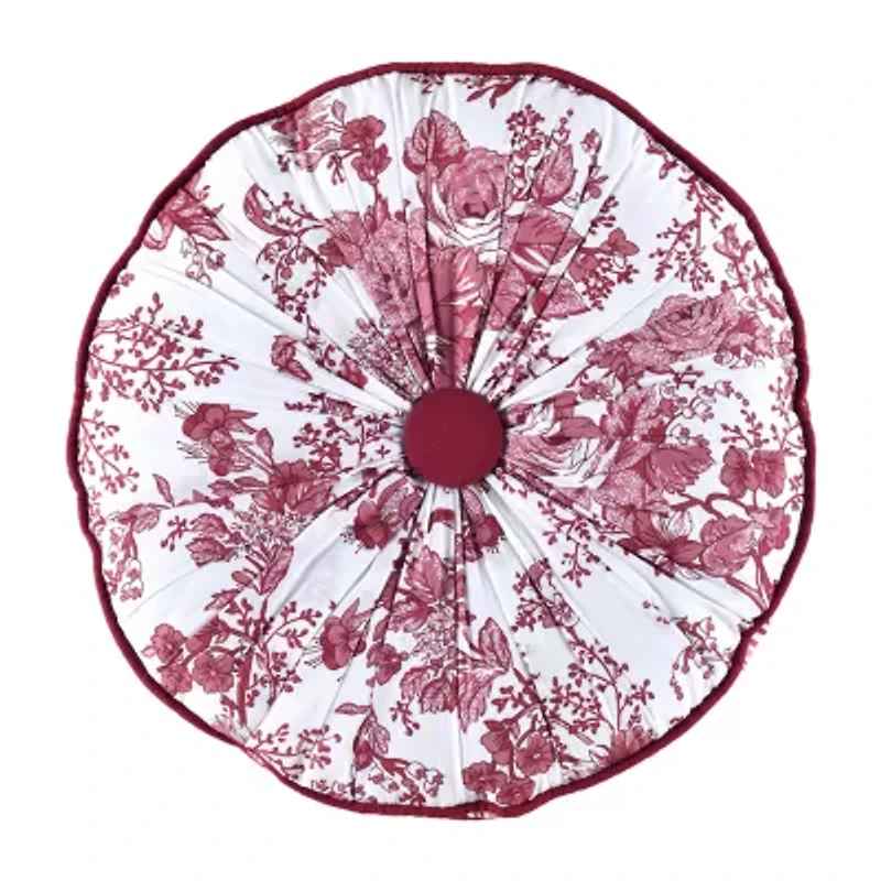 This charming decorative pillow coordinates with the Toile Garden bedding collection and adds an extra layer of texture and detail to your bed. Button-tufted accent pillow is quilted floral toile with striped gusset reverses to stripes measures 16" round. Cotton with polyester fill. Spot clean. Imported.