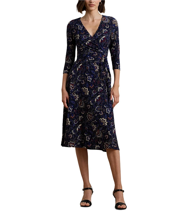 Lauren Ralph Lauren Carlyna Floral Print Matte Jersey Surplice V-Neck 3/4 Sleeve Self-Tie Belt A-Line Dress