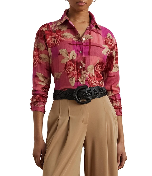 Lauren Ralph Lauren Plus Size Floral Point Collar Long Sleeve Button Front Linen Shirt