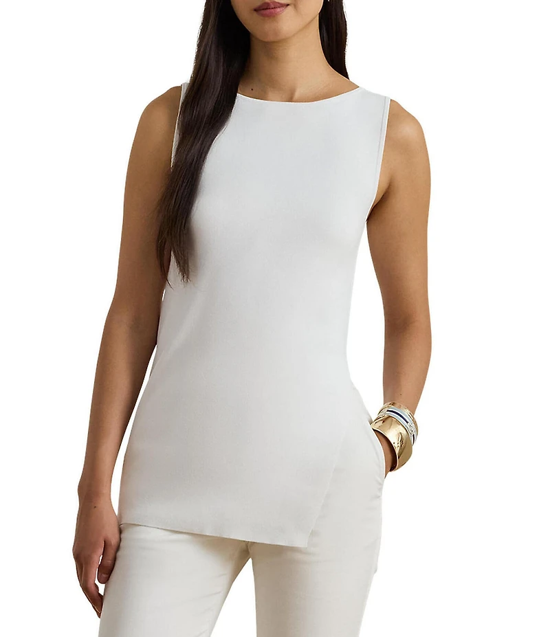 From Lauren Ralph Lauren, this sweater top features: Rib-knit fabrication Boat neckline Sleeveless Slim fit Left-side-seam slit creates an asymmetric hem Pullover construction Approx. 25" length Viscose/nylon  Hand wash or dry clean Imported.