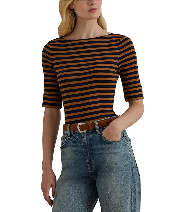 Lauren Ralph Lauren Stretch Cotton Striped Boat Neck Elbow Sleeve Tee
