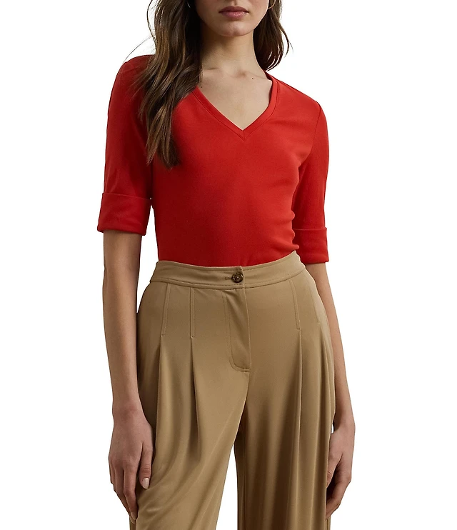 Lauren Ralph Lauren Stretch Cotton V-Neck Elbow Sleeve Fitted Tee