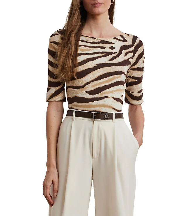 Lauren Ralph Lauren Stretch Cotton Zebra Boat Neck Elbow Sleeve Tee