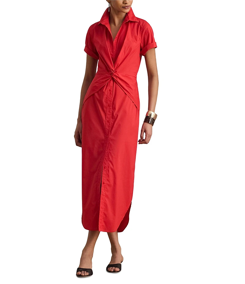 From Lauren Ralph Lauren, this dress features: Stretch silky cotton fabrication Shirtdress silhouette Point collar Short sleeves with rolled cuffs Twist front Back waist darts Maxi length Shirttail hemline Front button placket closure Approx. 50" length Cotton/nylon/elastane Machine wash cold or dry clean Imported.