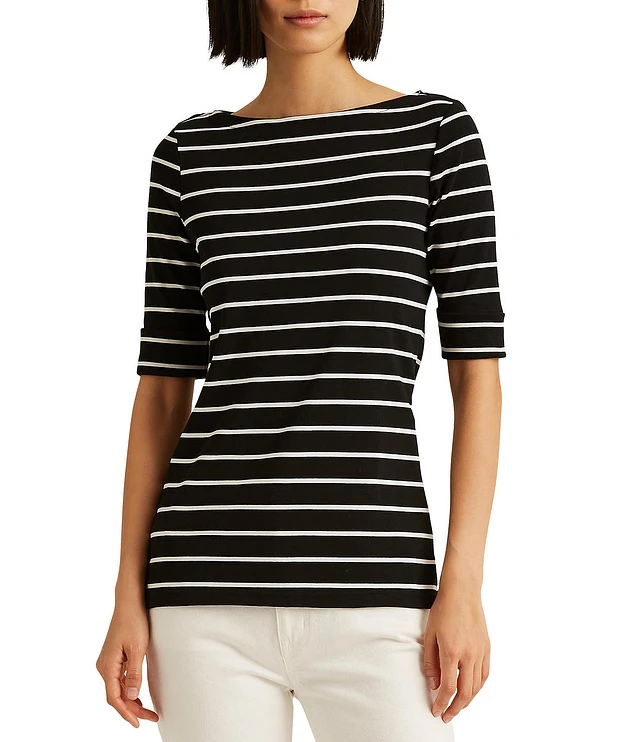 Lauren Ralph Lauren Stripe Knit Stretch Cotton Boat Neck Elbow Length Sleeve Tee