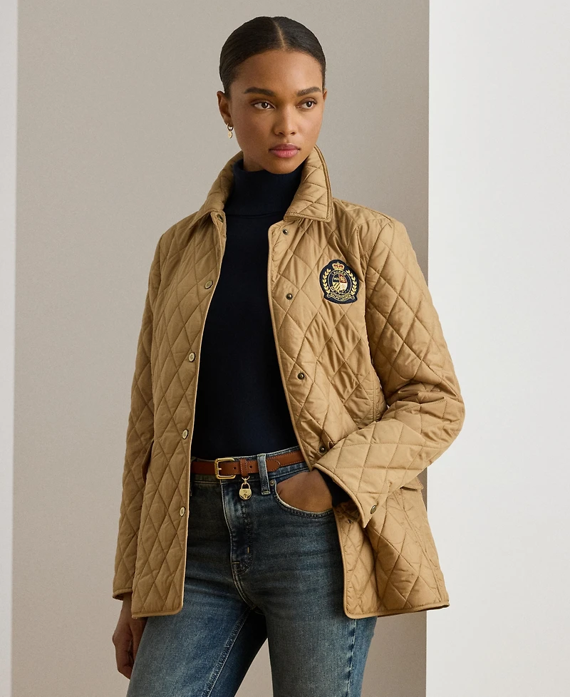 Diamond quilting brings rich dimension and refined style to this Lauren Ralph Lauren jacket, which displays Lauren's crest patch at the chest for an iconic look. Sophisticated and functional, this layer is lightly filled to keep you warm.