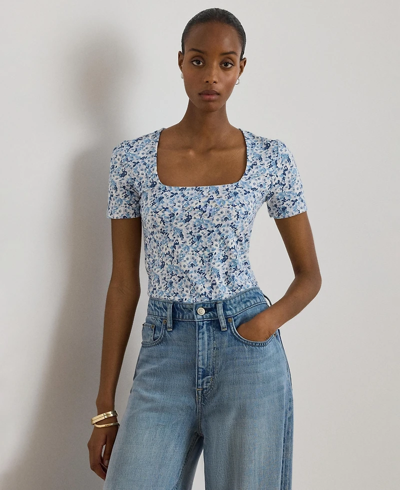 Elegant simplicity defines this Lauren Ralph Lauren slim-fit short-sleeve top with a square neckline and a tailored silhouette. Stretch jersey ensures ease of movement, while the streamlined design works seamlessly with skirts, denim, or tailored pants for versatile styling.