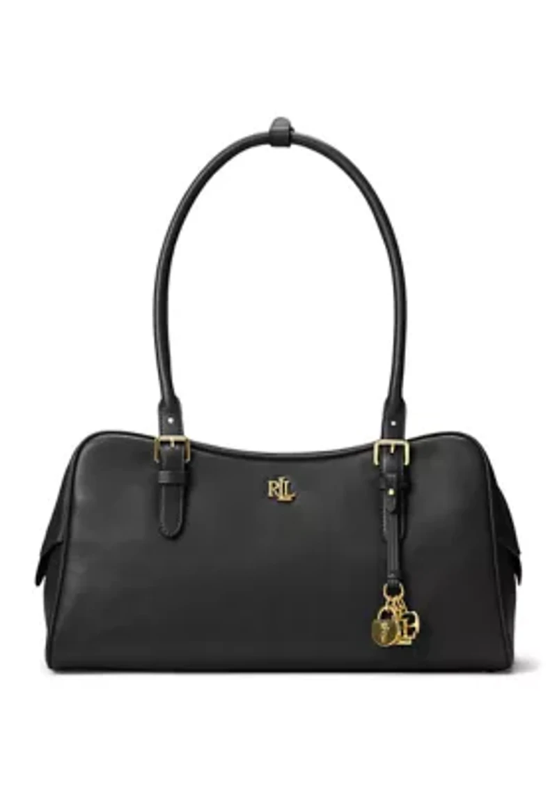 Crafted with supple full-grain leather for a naturally smooth finish, the large Marcy zip bag from Lauren Ralph Lauren offers a modern interpretation of the satchel with a soft east-west silhouette and elongated handles. A two-way zipper provides added security for essentials, while a variety of detachable charms add signature style. Two adjustable top handles, each with a 10.25" maximum drop Leather loop snap allows you to connect the handles together Two-way top zip closure Brass-finished "LRL" logo at the front Brass-finished plaque custom-developed with a “Lauren Ralph Lauren est. 1967” logo at the interior Detachable leather strap with brass-finished logo, padlock, and equestrian-inspired charms Zip pocket and two slip pockets at the interior 7.25" H x 14" L x 5.75" D Weighs approximately 1 lb., 15.5 oz Lining is made with polyester and recycled polyester Shell: leather Lining: polyester Ensure that any spill is wiped off leather immediately For harder to remove stains, it is recommended to seek professional cleaning by a leather specialist Imported Includes a dust bag Imported