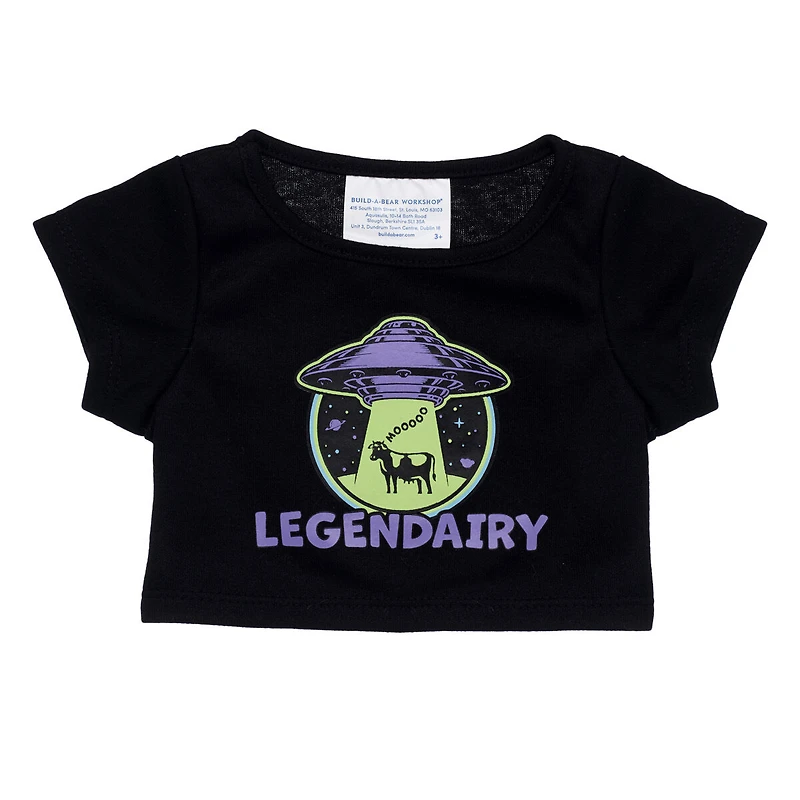This intergalactic tee makes a "legendairy" look for your furry friend! This black stuffed animal tee features a neon green and purple graphic of a cow being beamed up into a UFO.