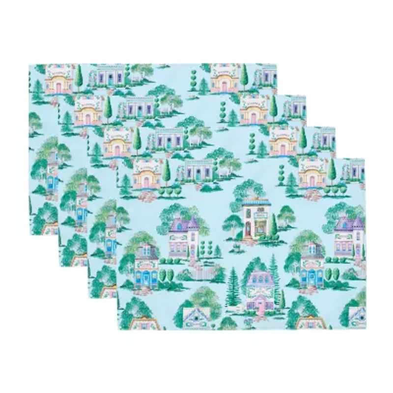 As lovely as it is whimsical, the Lenox Spice Village Allover Placemat Set captures the nostalgic storybook charm of the beloved Spice Village collection. Its picturesque design features pastel cottages and gardens in soft watercolor hues, set against a serene pastel blue background. This charming pattern brings warmth, color, and personality to any dining experience. Crafted from 100% polyester, these placemats offer both elegance and easy maintenance. The durable fabric resists wrinkles and everyday wear, ensuring they retain that just-set, fresh and inviting look for years to come. Simply machine wash cold with like colors, use only non-chlorine bleach when needed, tumble dry low, and warm iron if desired. Each place sets measures 13 x 19 inches, offering generous coverage for a polished, elegant table setting. Complete your charming kitchen or dining room with other pieces from the Lenox Spice Village collection, including the Spice Village jar sets, accent decor, coordinating table linens, and kitchen accessories, all designed to complement one another beautifully.