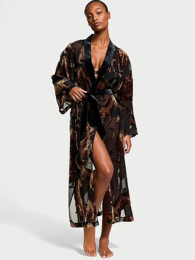 iRelax Long Sleeve Shawl Collar Plush Velour Animal Print Long Robe