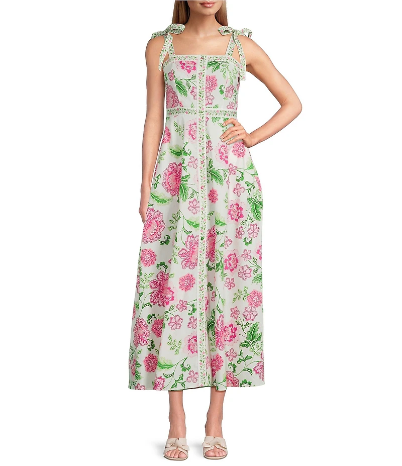 From Leslie Fay, this dress features: Cotton poplin fabrication Square neckline Sleeveless Lined Floral design Bowtie shoulder straps Front button closure Approx. 53" in length Cotton/spandex Hand wash cold Imported.