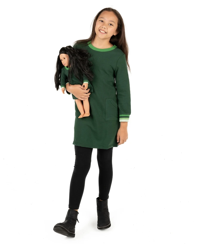 Designed for comfort with a playful twist, this matching girl and doll knit dress brings effortless style to everyday dressing. The relaxed, tunic-inspired silhouette features a soft knit feel, long sleeves, and a classic crew neckline for easy layering through the seasons. A slight A-line shape and knee-length hem create a flattering, school-ready look, while thoughtful details like contrast trim, front patch pockets, or a back stripe accent add a fun pop of personality. Easy pull-on styling makes mornings simple, and the coordinating 18" doll dress completes the sweet twinning moment. From classroom days to weekend outings, this casual favorite is made for memory-making.
