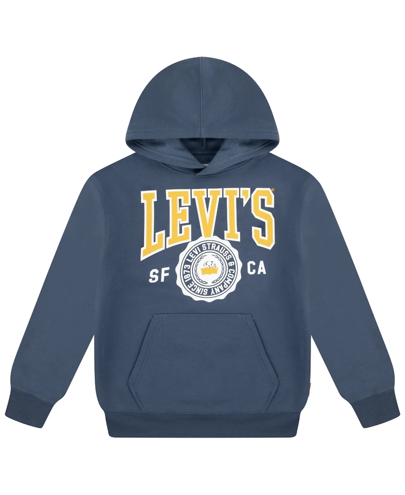 Cozy up in style with this Levi's hoodie, featuring long sleeves with ribbed cuffs, an elastic hemline, and a classic kangaroo pocket. The varsity-inspired logo adds an authentic touch, making it a versatile choice for casual outings or relaxing at home.