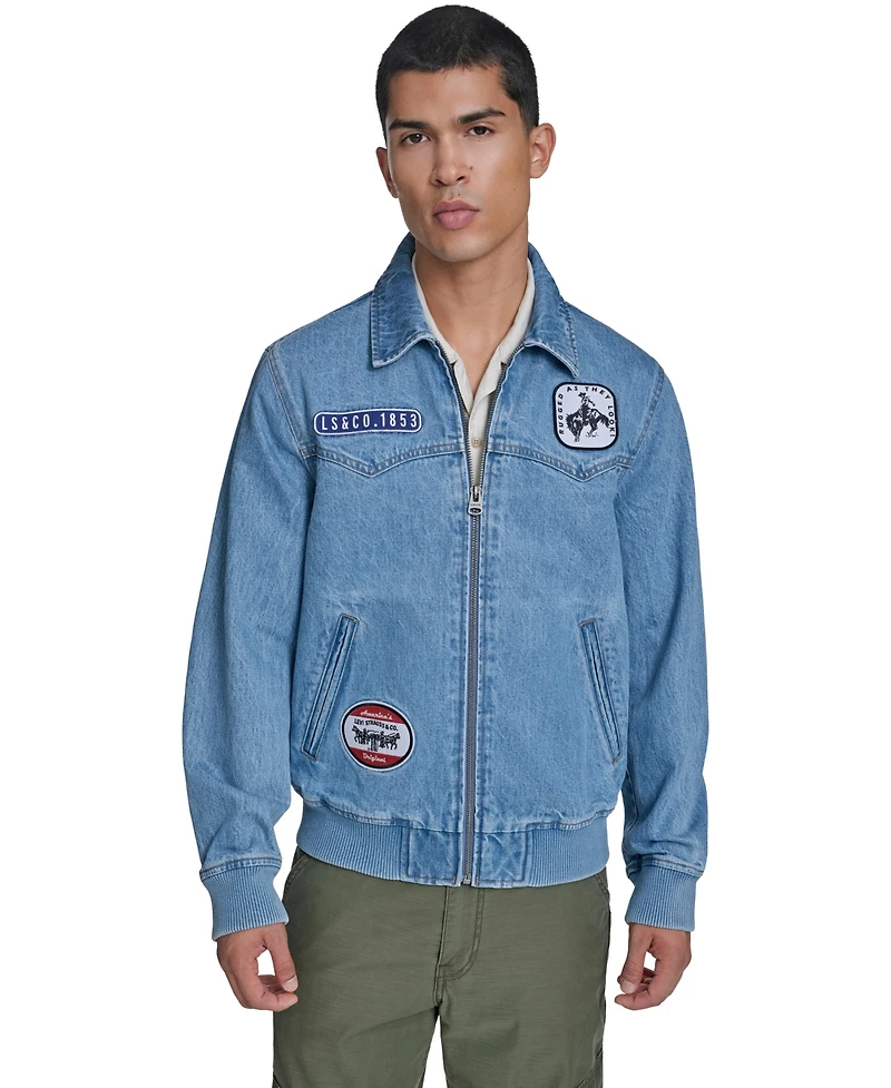 Levi's Men's Cotton Denim Bomber with Levi's patches, rib knit hem and cuffs, laydown collar, front zipper closure, two lower pockets.