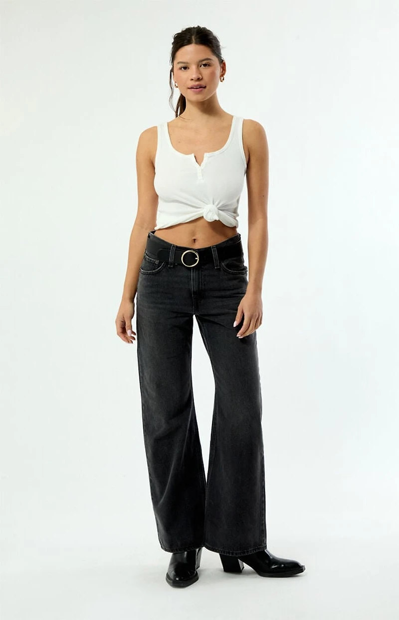 The Wanderin Middy Loose Bootcut Jeans from Levi’s bring effortless throwback vibes with a modern, laid-back edge. Featuring a mid-rise fit, black wash, rigid fabric, 5-pocket body, zip fly closure, and a loose bootcut leg, they’re the perfect pair for easy styling from day to night.